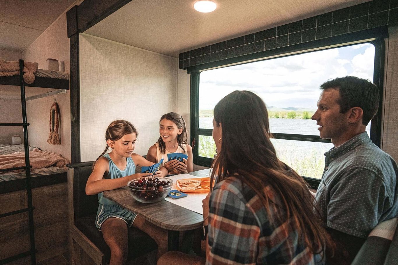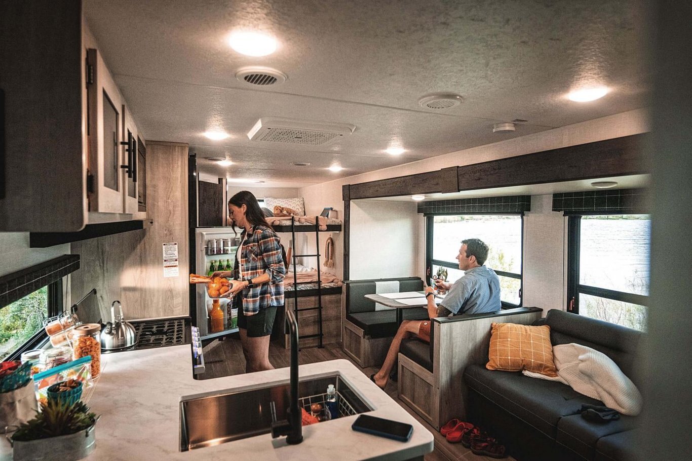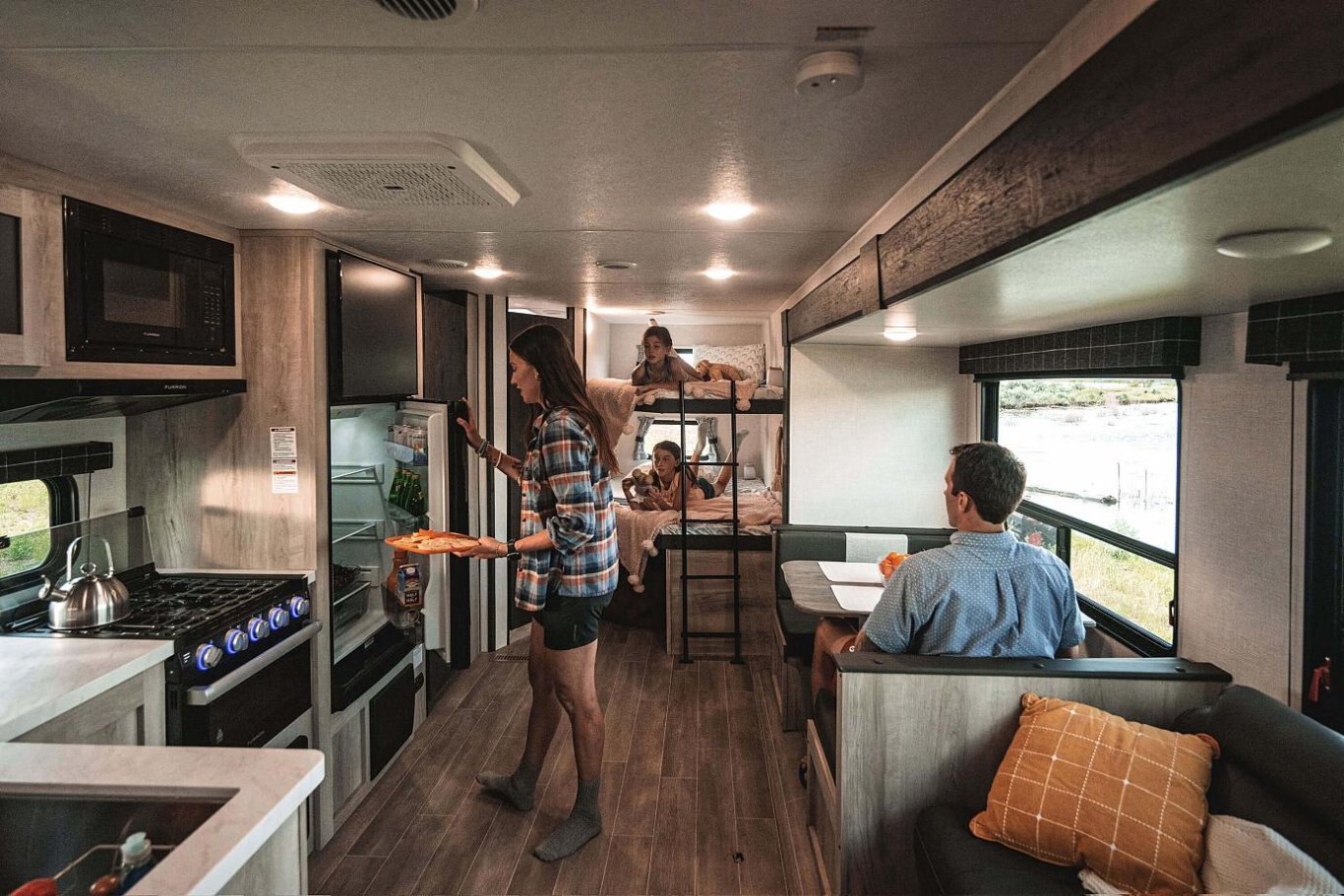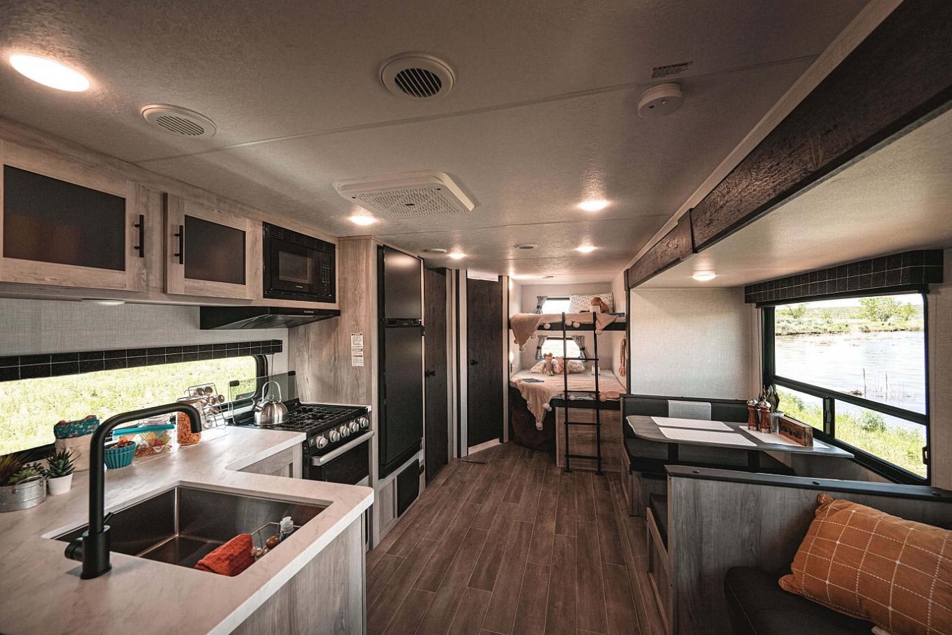 INTERIOR Residential-Grade Linoleum 10 CU FT 12V Refrigerator w/Dual-Temperature Control Black Residential Kitchen Faucet Interior Control Switches on Overhead End Cabinet w/Convenience Center for Switches Electric Outlet in Bunk Area Microwave