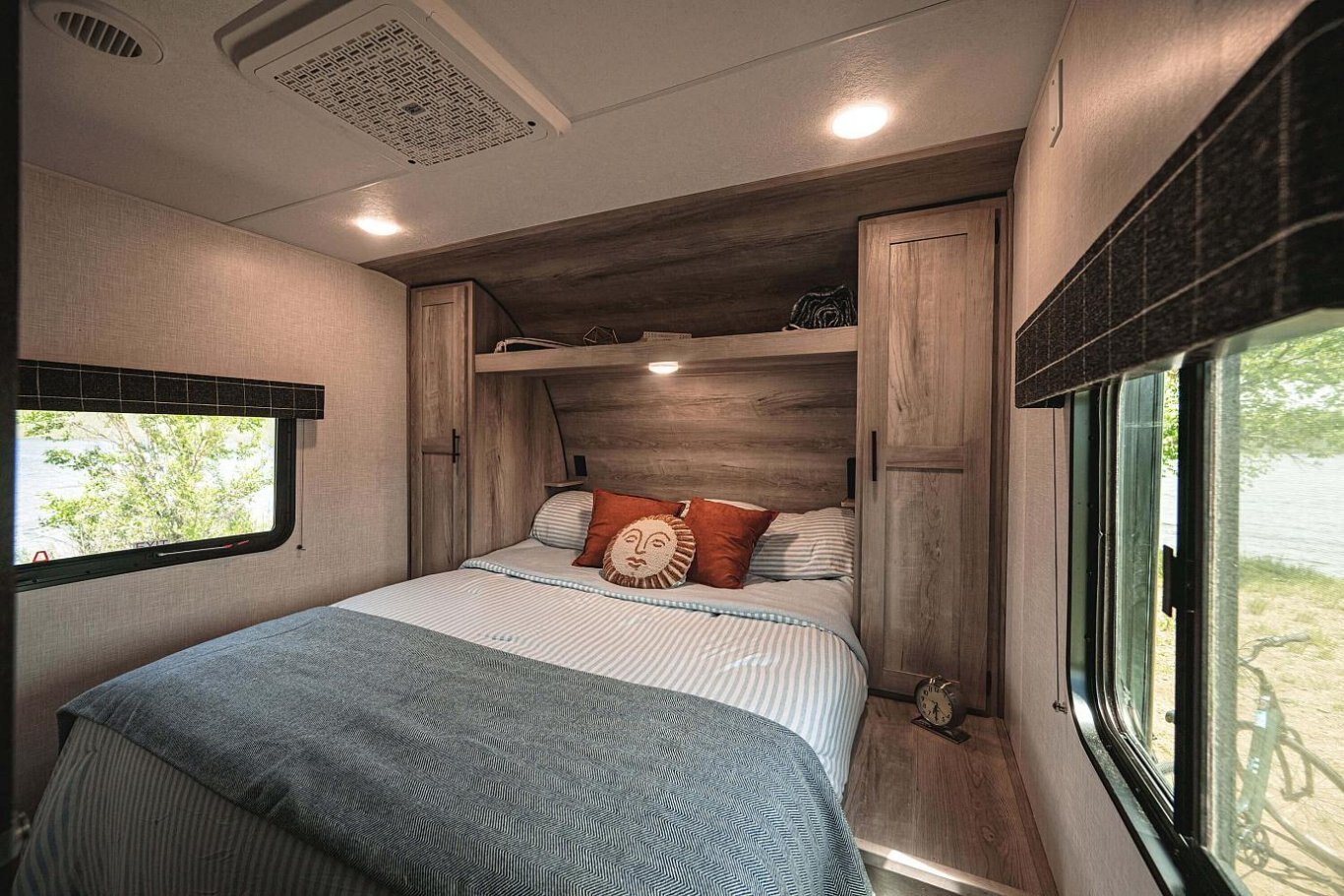 Power Vent in Bath Shower Surround Reversible Quilted Comforter Digital TV Antenna w/Booster 13,500 BTU A/C Water Heater Bypass Kit Large Overhead Cabinets Roller Ball Bearing Drawer Glides LED Interior Lighting Linoleum Throughout Monitor Panel 3-Burner Cooktop Range Hood w/12V Light & Exhaust Fan Microwave w/Turntable