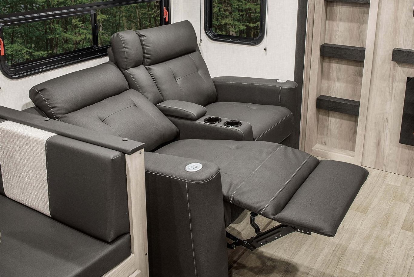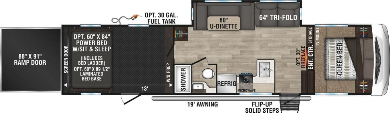 F/S Dinette Table & Chairs IPO Dinette Tri-Fold Hide-A-Bed Sofa IPO Jackknife (331TH13) Theater Seating IPO Jackknife (331TH13) 10 CU FT 12V Refrigerator IPO 8 CU FT Gas/ Electric Refrigerator 30" Fireplace (required on 331TH13) MaxxAir Vent Fan (cargo or living room or bath) (required on TTs, 331TH13) Sit-n-Sleep w/Power Bed & Ladder (required on 270THR)