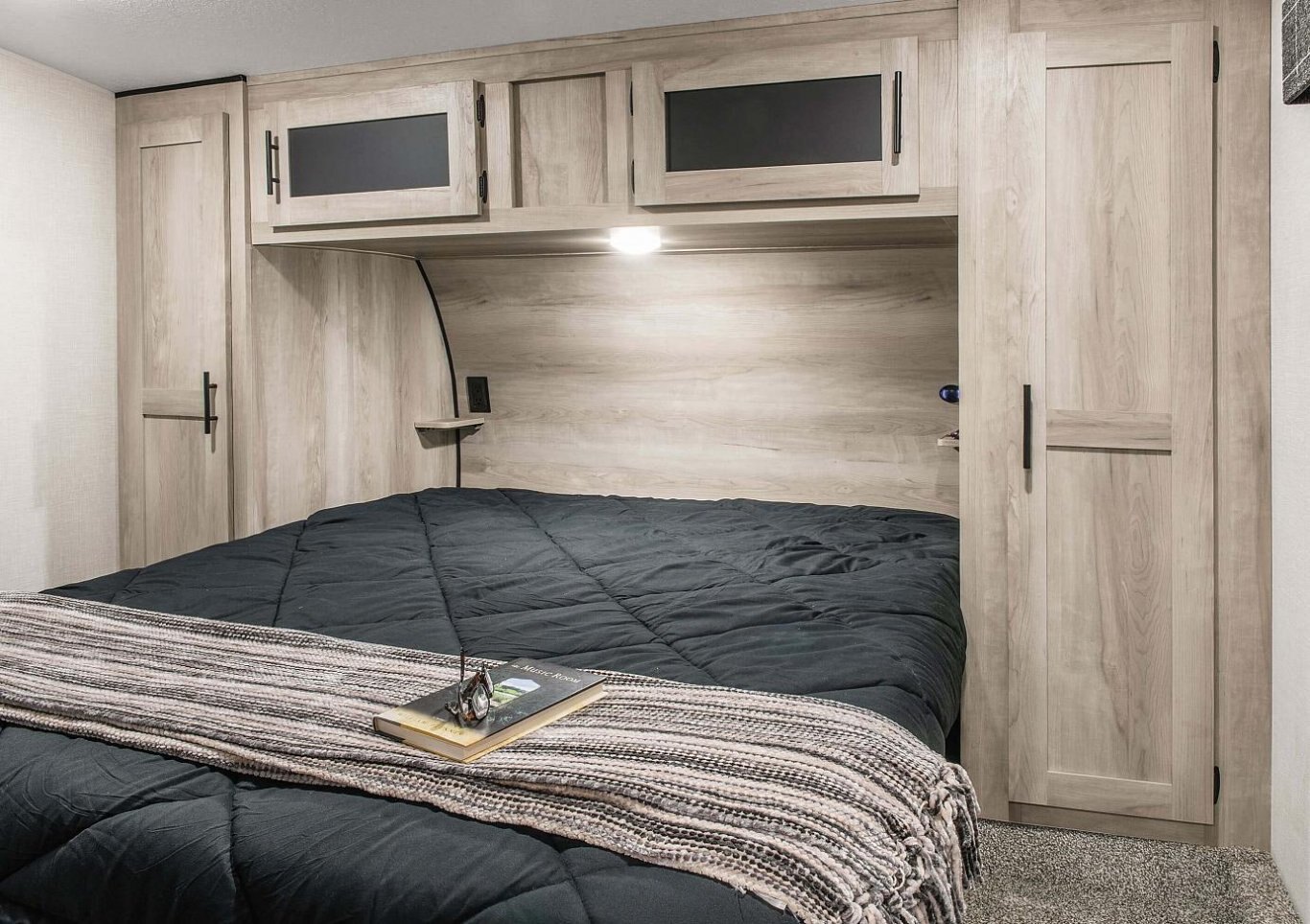 Built-in Medicine Cabinet w/Mirror in Bathroom Shower Surround Power Vent in Bathroom Flush-Floor Bedroom (FWs) Queen Mattress Linoleum Throughout Roller Ball Bearing Drawer Glides Super-Sized Panoramic Slide Room Window LED Interior Lighting Monitor Panel Digital TV Antenna w/Booster 3-Burner Cooktop Range Hood w/12V Light & Exhaust Fan Oven Microwave w/Turntable Large Overhead Cabinets