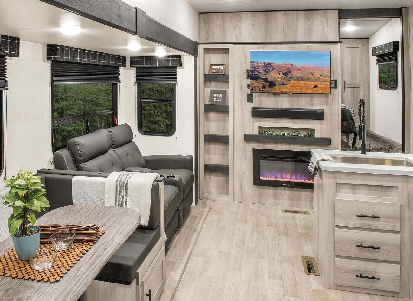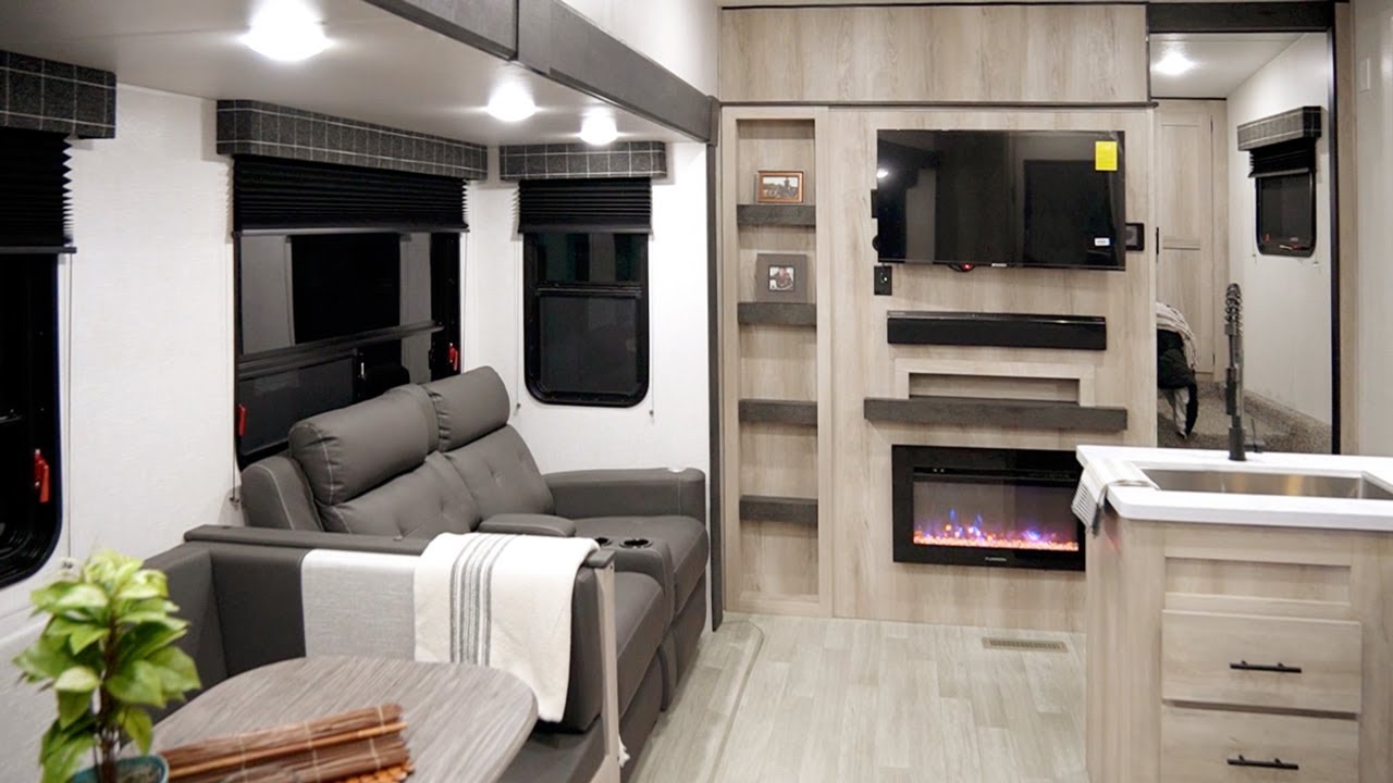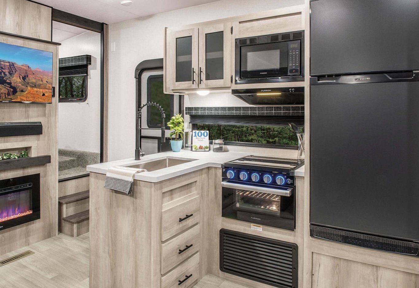 INTERIOR Lithium Ready Converter RV Airflow A/C System w/Air Filter - More Info Seamless Countertops w/Deep Undermount Stainless Steel Kitchen Sink Roof Ladder Sink Cover Drop-in Cooktop w/Glass Cover & Oven Kitchen Skylight 36" Storage Bins in Booth Dinette Bright White LED Light Strip above Main LR Slide Room(s) Tri-Fold Sofa (2) Motion Sensor Lights LED TV Multi-Media Sound Bar Stereo w/Bluetooth HDMI & USB Charge (2) 6.5" Interior Speakers (2) 12V USB Ports in Bedroom Pleated Shades Foot-Flush Toilet Serta Comfort Foam Mattress (king bed – TTs only) W/D Prep in Garage Models (FWs) Wider Pocket/Passage Interior Doors Bathroom Shelf w/Towel Hooks