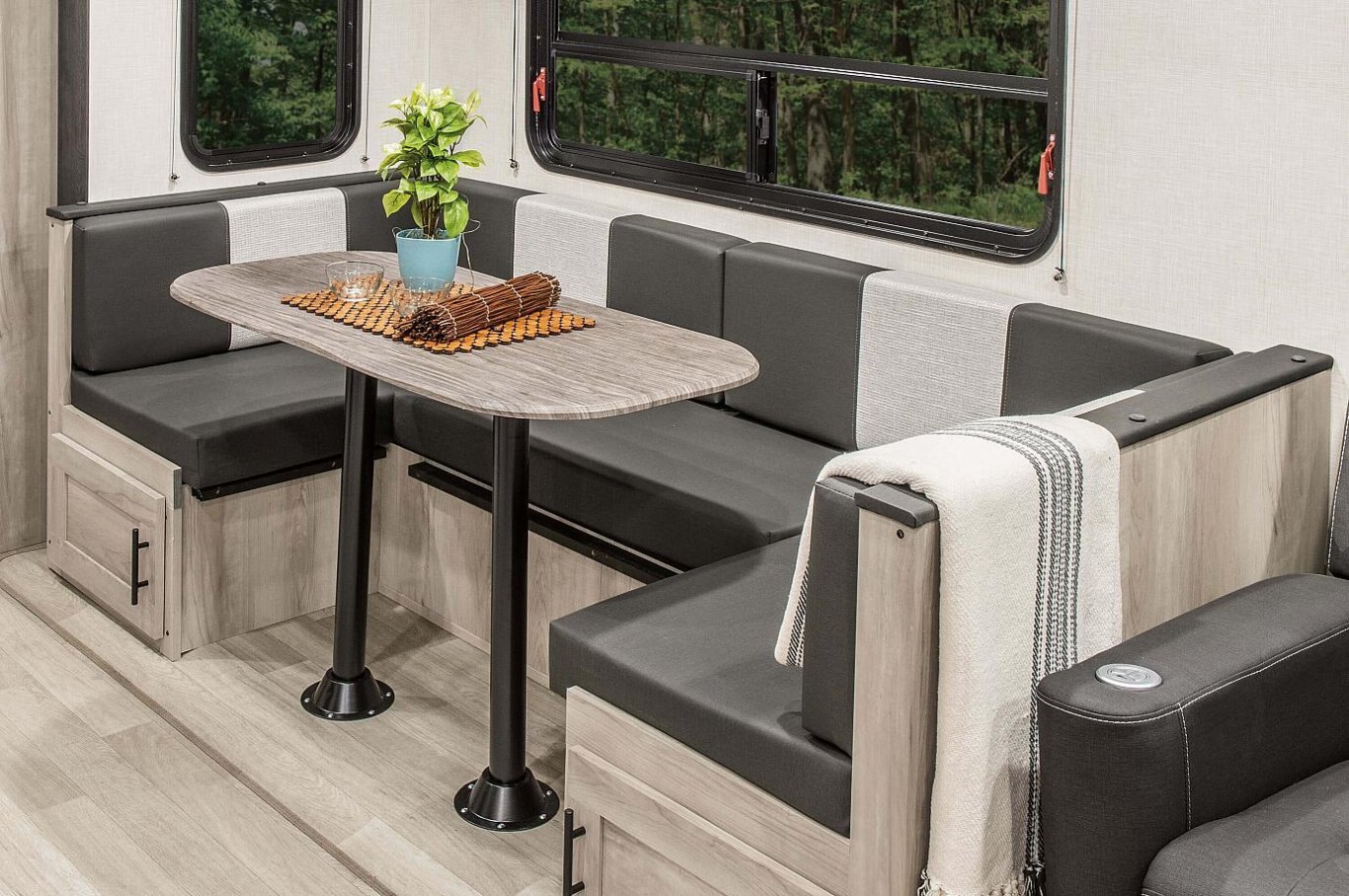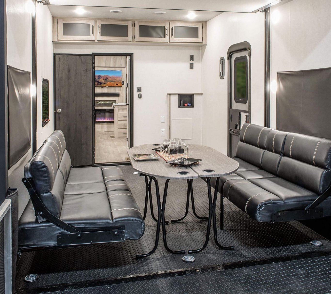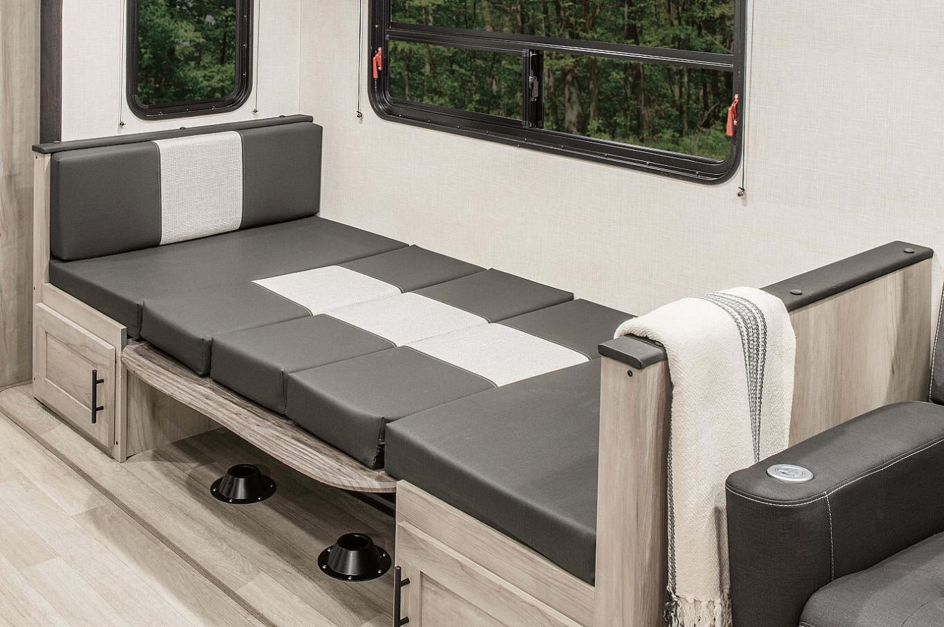 INTERIOR Lithium Ready Converter RV Airflow A/C System w/Air Filter - More Info Seamless Countertops w/Deep Undermount Stainless Steel Kitchen Sink Roof Ladder Sink Cover Drop-in Cooktop w/Glass Cover & Oven Kitchen Skylight 36" Storage Bins in Booth Dinette Bright White LED Light Strip above Main LR Slide Room(s) Tri-Fold Sofa (2) Motion Sensor Lights LED TV Multi-Media Sound Bar Stereo w/Bluetooth HDMI & USB Charge (2) 6.5" Interior Speakers (2) 12V USB Ports in Bedroom Pleated Shades Foot-Flush Toilet Serta Comfort Foam Mattress (king bed – TTs only) W/D Prep in Garage Models (FWs) Wider Pocket/Passage Interior Doors Bathroom Shelf w/Towel Hooks