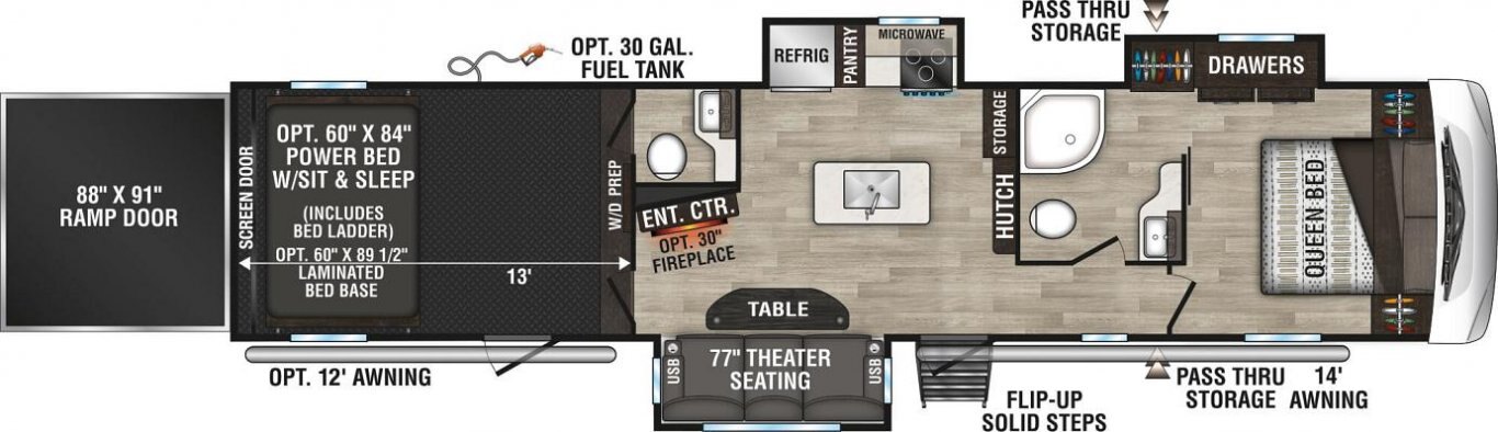 F/S Dinette Table & Chairs IPO Dinette Tri-Fold Hide-A-Bed Sofa IPO Jackknife (331TH13) Theater Seating IPO Jackknife (331TH13) 10 CU FT 12V Refrigerator IPO 8 CU FT Gas/ Electric Refrigerator 30" Fireplace (required on 331TH13) MaxxAir Vent Fan (cargo or living room or bath) (required on TTs, 331TH13) Sit-n-Sleep w/Power Bed & Ladder (required on 270THR)