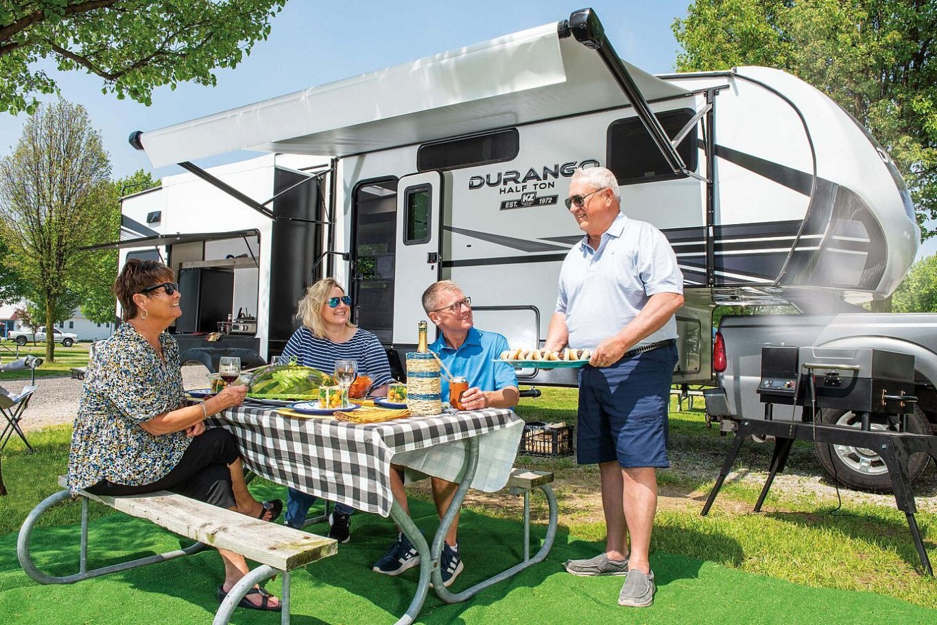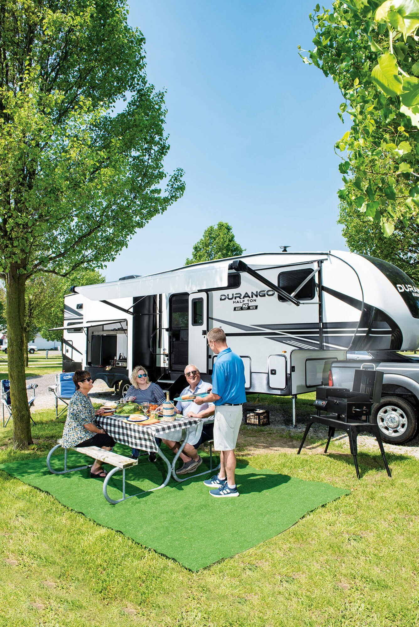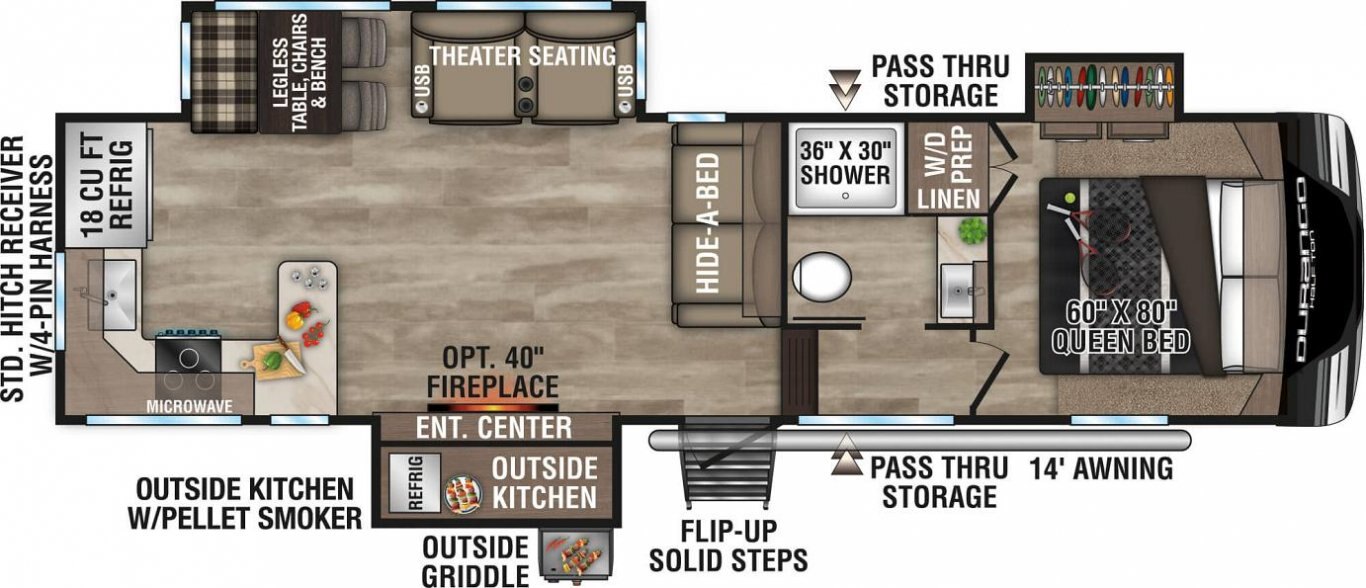 Durango Half-Ton is where lightweight travel meets fifth wheel amenities. Rest and enjoy all the comforts this RV has to offer, from the modern interiors, optional electric fireplace, and additional outdoor kitchen area (select models).