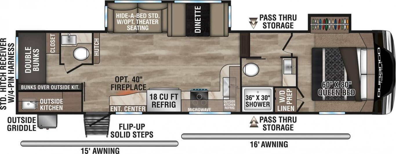 Durango Half-Ton is where lightweight travel meets fifth wheel amenities. Rest and enjoy all the comforts this RV has to offer, from the modern interiors, optional electric fireplace, and additional outdoor kitchen area (select models).