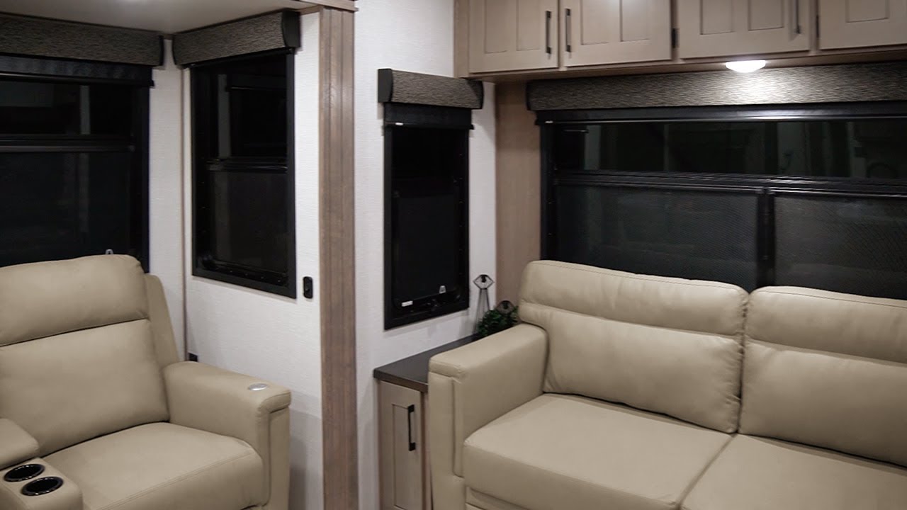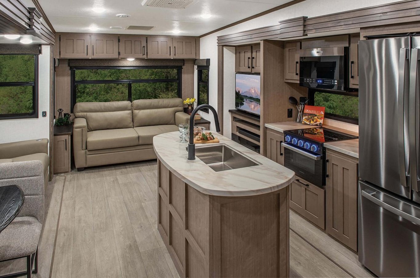 INTERIOR 18 CU FT House Refrigerator w/2,000W Inverter Matte Black Residential Kitchen Faucet w/Sprayer Curved Hardwood Step in Hallway Wood Accent Trim on Corners/Entry Doors Electric Outlet in Bunk Area 24" Microwave Vision S Prep (blind spot monitoring) On-Demand Tankless Water Heater Lithium Battery Ready JBL Flip 5 Bluetooth Speaker w/Locking Wall-Mount in Basement Storage Area