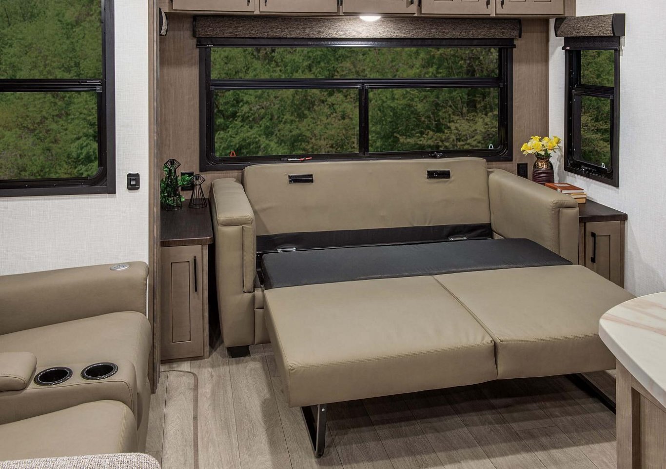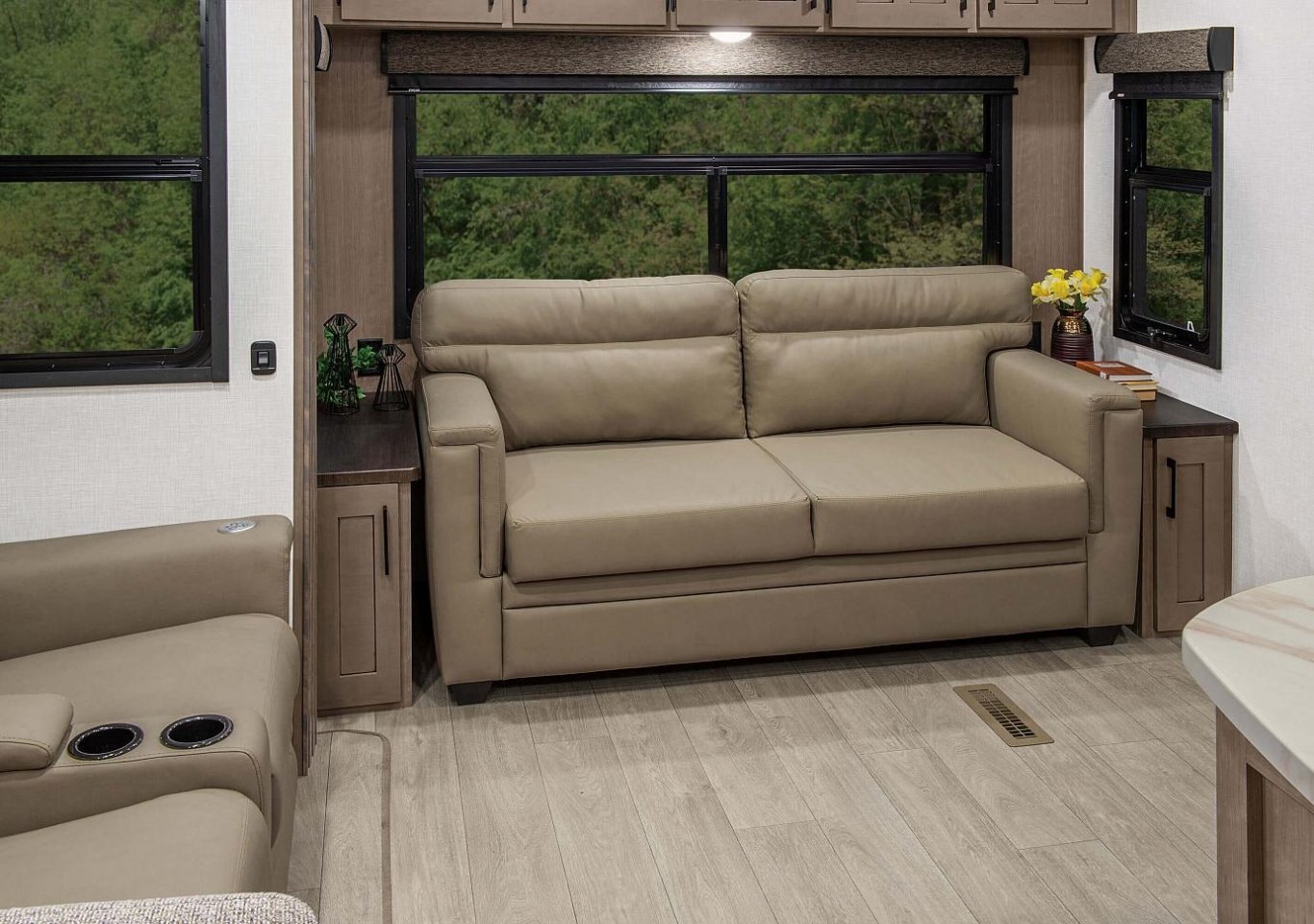 INTERIOR Blancher Cherry Cabinetry Beauflor Flooring in Slideouts Solid Hardwood Slideout Fascia Seamless Countertops w/Deep Undermount Stainless Steel Kitchen Sink w/Sink Cover Trash Can under Sink Drop-in Cooktop w/Glass Cover & Oven 36" Pullout Storage Bins in Booth Dinette (select models) Tri-Fold HAB Sofa (2) Motion Sensor Lights 43" Smart LED TV JBL 2.0 Sound Bar w/Bluetooth 12V Dual USB Charging Station Night Roller Shades Porcelain Foot-Flush Toilet Stainless Steel Bathroom Sink Large 30" x 36" Shower & Surround Plywood Bed Base Serta Comfort Foam 60" x 80" Queen Mattress Legless Table Base for Dinette Table & Chairs (select models) Pocket Door for Bathroom Soft Auto-Close Drawer Glides Washer/Dryer Prep in Bedroom RV Airflow A/C System w/Air Filter - More Info