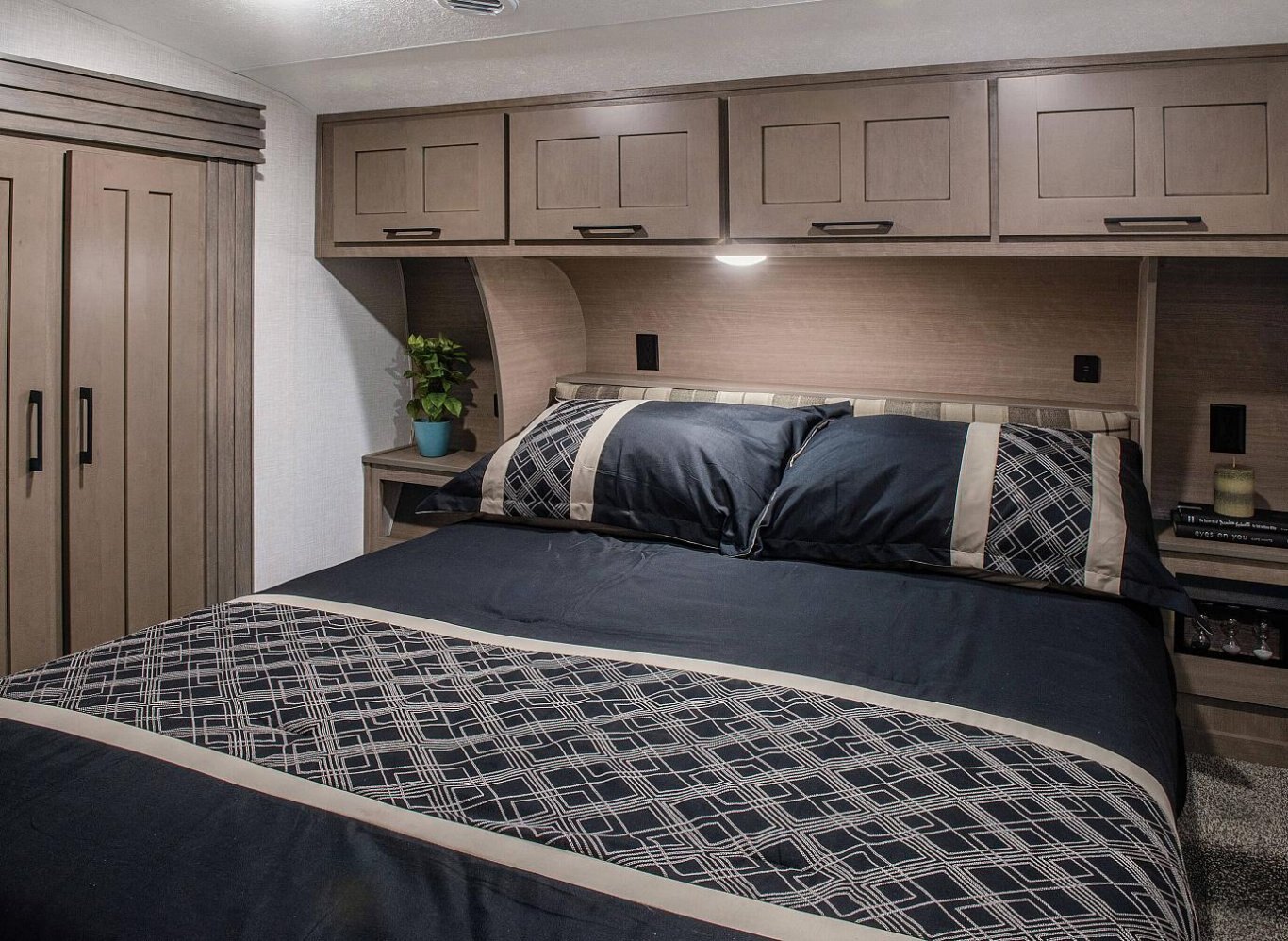 Shower Skylight Porcelain Foot-Flush Toilet All LED Lights in Bed & Bath w/Multiple Large Switches 12V Vent Fans in all Baths Bathroom Linen Closet (where available) Padded Headboard w/Shelf & Power at the Head of all Beds XL Under-Bed Storage Bedroom TV Pre-Wire