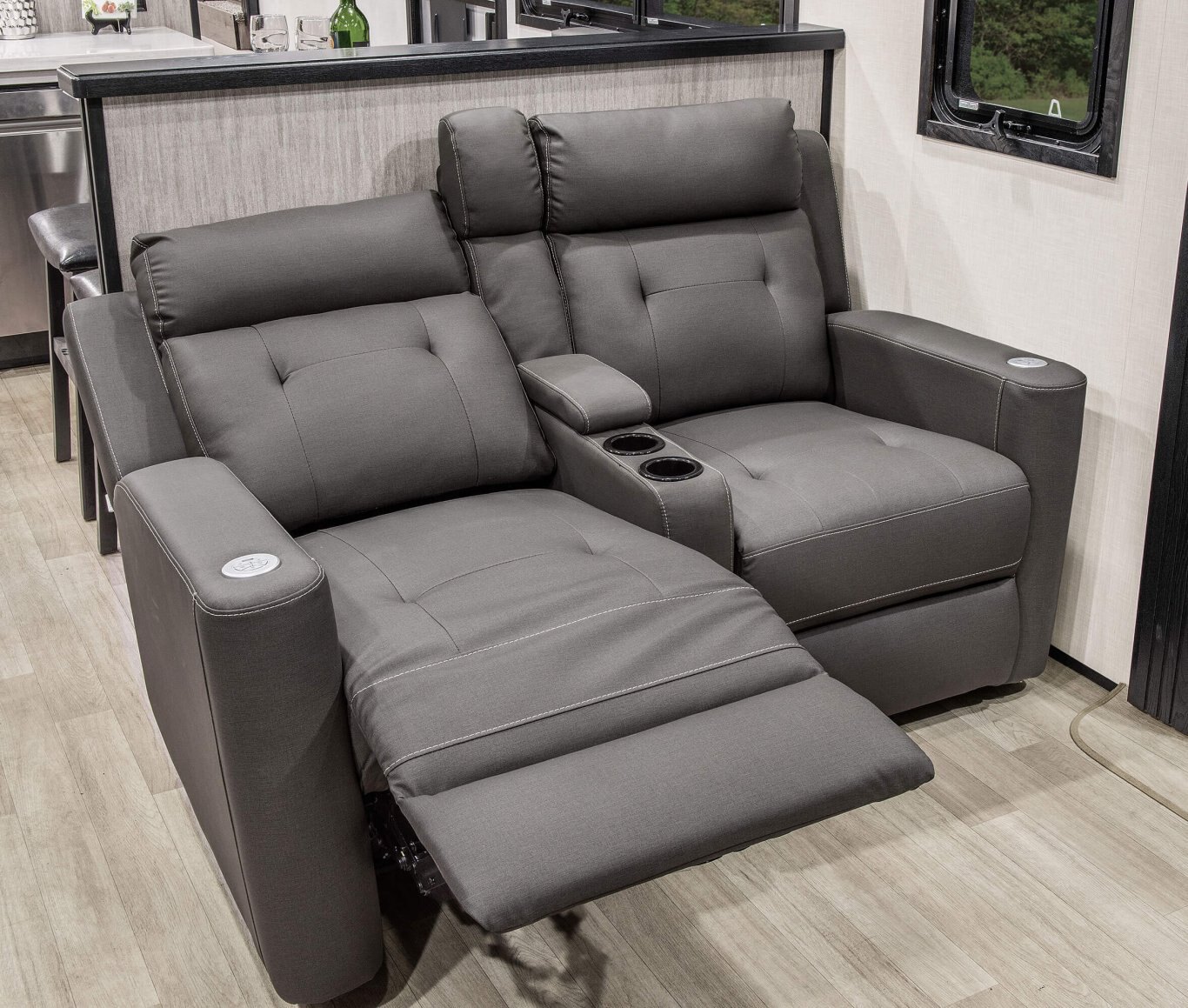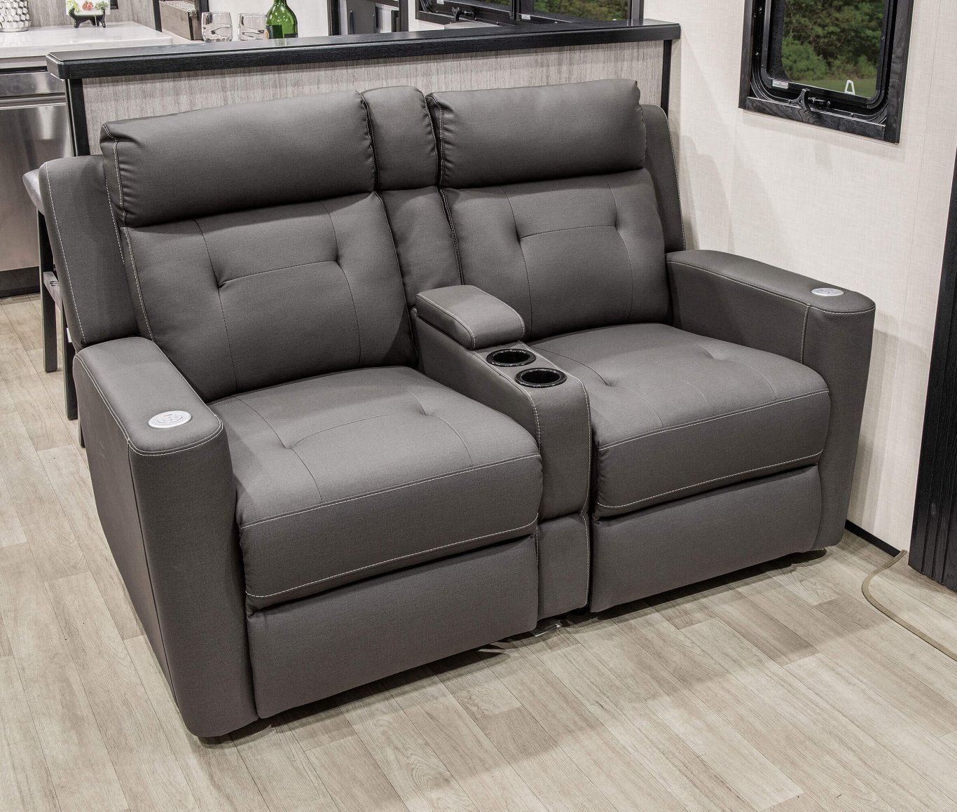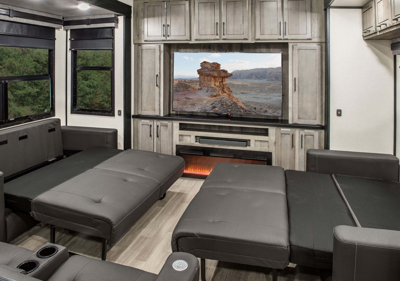 INTERIOR Blancher Cherry Cabinetry Beauflor Flooring in Slideouts Solid Hardwood Slideout Fascia Solid Surface Countertops w/Deep Undermount Farmhouse Stainless Steel Kitchen Sink w/Sink Cover 24" Oven w/4-Burner Range 30" Convection Microwave Stainless Steel Dishwasher Custom Shoe Rack in Closet (most models) Central Vac System w/Attachments Power Vent Fan in Main Area Theater Seating w/Powered Recline, Heat & Massage Features Tri-Fold HAB Sofa Solid Hardwood Dinette Legless Table w/4 Chairs (3) Motion Sensor Lights (entry, closet, basement) 40" Wideview Fireplace 50" Smart LED TV JBL 2.0 Sound Bar w/Bluetooth 12V Dual USB Charging Station Dual Day/Night Roller Shades Porcelain Foot-Flush Toilet Stainless Steel Bathroom Sink w/Faucet Plywood Bed Base Electric Tilt Bed w/Serta Comfort Foam King Mattress Bedroom Fireplace 32" Bedroom Smart LED TV 7' Tall Main Slide Ceiling Height Pocket Door for Bathroom & Bedroom Soft Auto-Close Drawer Glides Soft Auto-Close Hinges for Cabinet Doors Ceiling Fan in Living Room (most models)