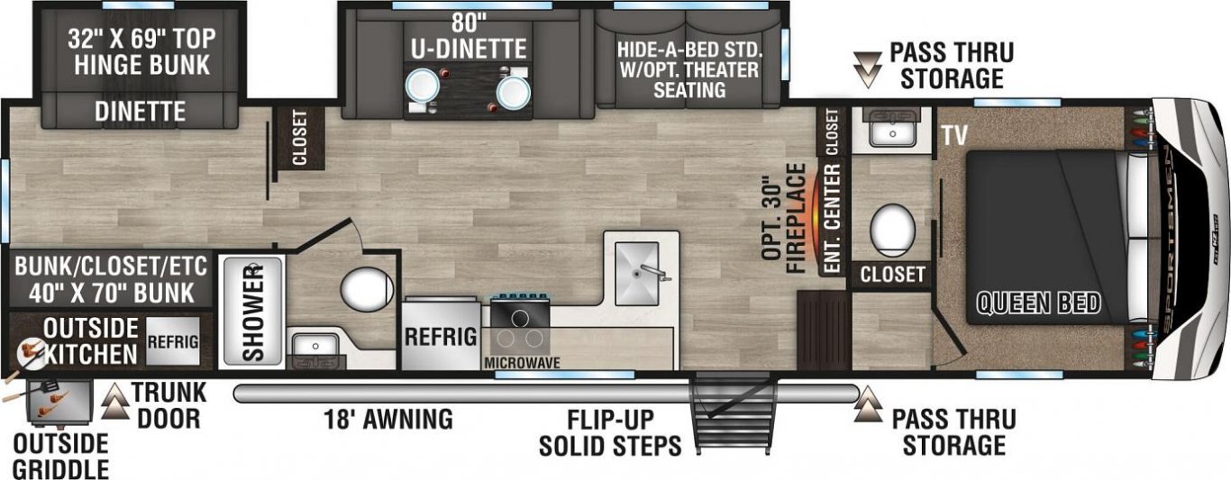 Starting at just 6,200 pounds and over 24' long, Sportsmen is where utility and comfort meet. Optional features like the outdoor griddle and fireplace will only upgrade your recreational lifestyle.