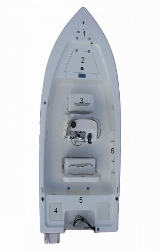 1) Top load anchor locker 2) Spacious storage 3) Removable cooler 4) Standard livewell, 2nd livewell option on port side 5) Battery storage under deck 6) Rod storage in gunnell.
