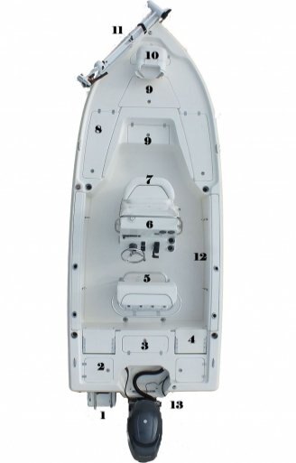 1) Optional swim platform 2) Dry storage compartment, port and starboard 3) Live well/ release well 4) Flip up jump seats 5) Standard leaning post 6) Potty room under console standard 7) Live well option under front seat 8) Rod box holds 5 7'6" rods each side 9) Forward live well 10) Bass seat option 11) Troll motor option 12) Gunnell rod storage up to 7" rods 13) Hydraulic jack plate option