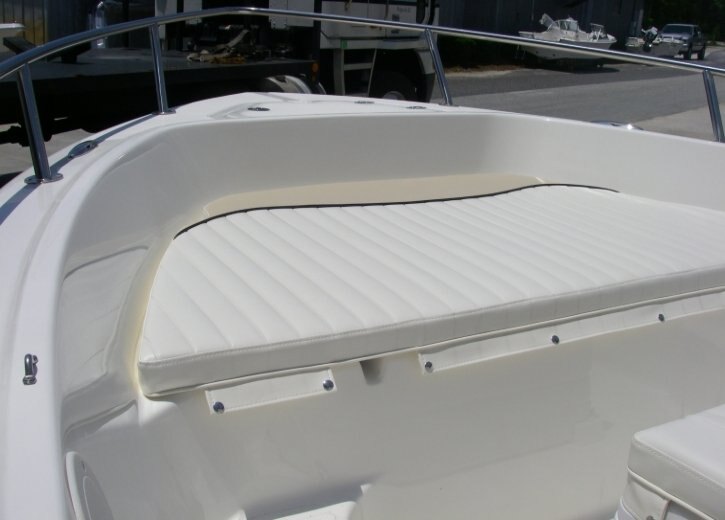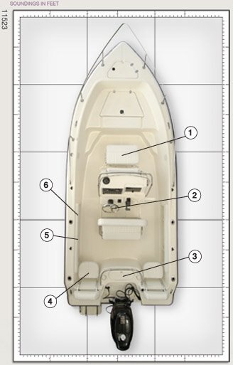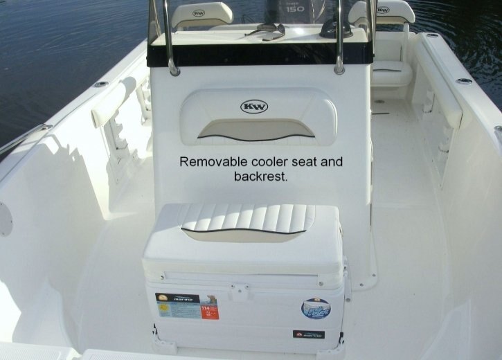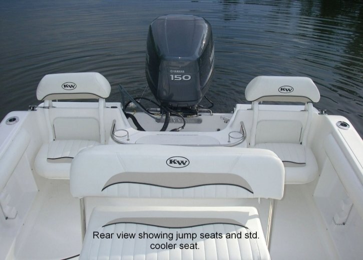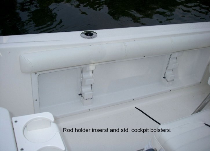 1) Removable cooler seat with cushions. 2) Hydraulic steering. 3) Livewell with high speed pick up pump. 4) Removable jump seats fit in extra rod holders. 5) Rod storage in gunnells. 6) Cockpit bolsters standard equipment.