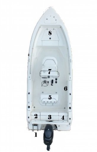 1) Boarding ladder 2) Removable cushions 3) Live well 4) Dry storage 5) Leaning post (option) 6) Rod storage under gunnel 7) Potty room under console 8) Dry storage