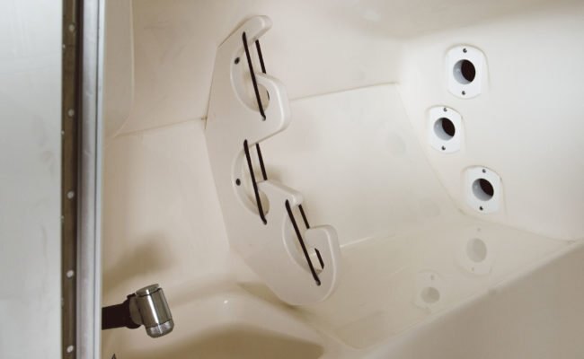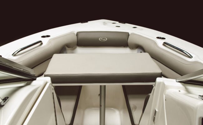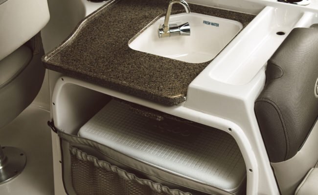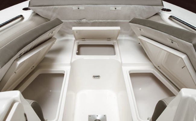 It is loaded with amenities for comfort and performance, like the built-in hardtop, comfortable bow seating, a wraparound bench seat in the cockpit, a sink with storage, and a standard potty room in the console. It is also self-bailing and foamed to provide upright and level flotation, making it one of the safest family-friendly boats on the market.