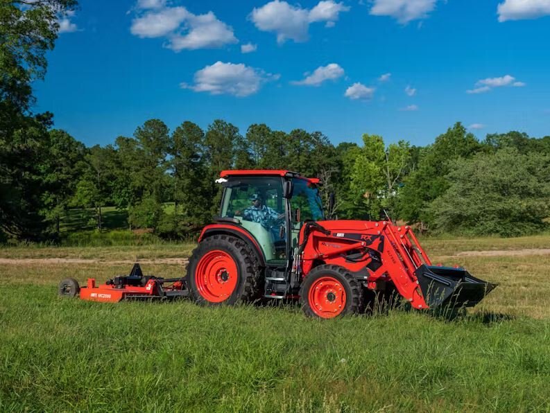 | KIOTI RX7340P utility tractor with power shuttle transmission, 73-horspower, and 4,327 pound lift capacity, It offers a serious power upgrade making them ideal for demanding tasks like hauling hay and maintaining livestock. |