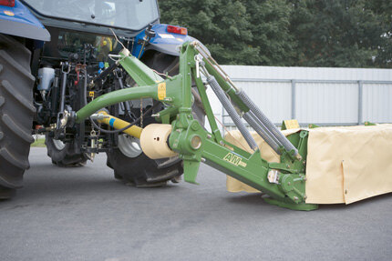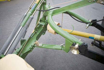 Absolutely safe: The KRONE break-back system relies on an adjustable coil spring, which responds instantly and dependably and allows the mower to swing back and up when impacting a foreign object.