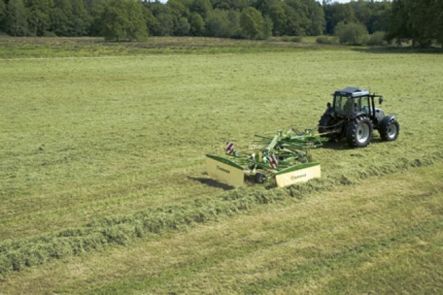 The KRONE 710/26 T twin-rotor side delivery rake with 13 tine arms not only offers excellent value for money but excellent quality of work. Swadro 710/26 T forms single and double windrows as well as two narrow windrows. Naturally it offers a hydraulic system that adjusts the main frame to set the work width and thus windrow width