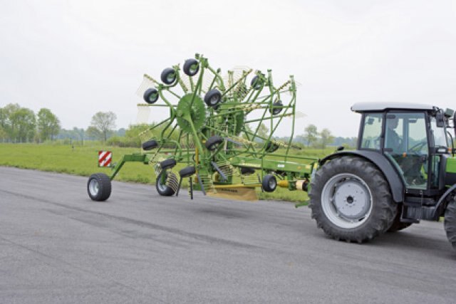 Trailed single-rotor rakes: KRONE added the Swadro 38 T, 42 T and 46T models to its range of rakes to meet farmer demands at home and abroad. The demand is for a trailed and well-proven single-rotor rake that offers the well-proven Swadro technology. The tandem axle on these models serves also as transport running gear on public roads.
