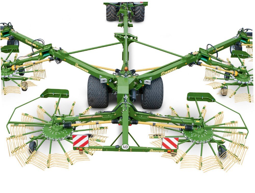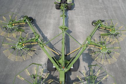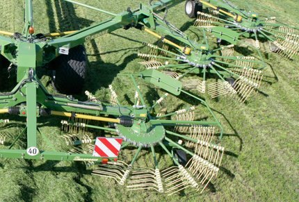 The giant centre-delivery rake: Relying on six rotors and offering variable work widths between 10 m (32'10") and 19 m (62'4"), Swadro 2000 from KRONE is the biggest machine on the market which brings you unsurpassed efficiency, very little maintenance and quickest changeovers as well as high transport speeds, great longevity and a maximum of operator comfort and on top covers up to 20 hectares (49.5 acres) per hour. The windrows produced by Swadro 2000 are about 30% shorter per hectare than those produced by a four-rotor rake. A 30% shorter windrow translates into fewer passes and an up to 15% higher output of the following harvesters. As such, Swadro 2000 presents the ideal machine for large-scale and contracting operations. |