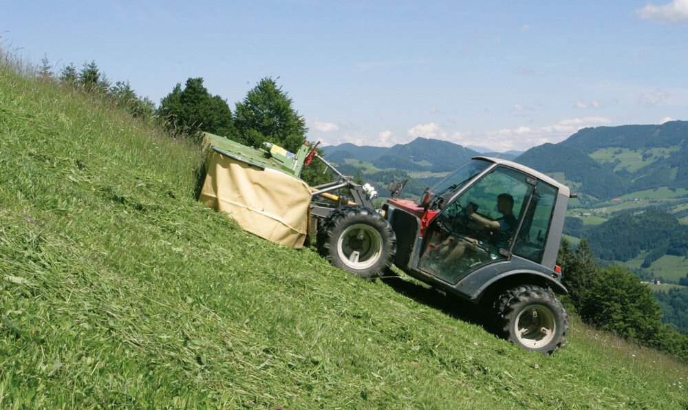 Mountain farming is a particular challenge to man and machine. The front-mounted 2.73 m (8’11") EasyCut F 280 M, the 3.16 m (10'4") F 320 M, and the 3.60 m (11'9") F 360 M disc mowers are the ideal machines to take on the challenge, boasting a compact design, a centre of gravity close to the tractor, perfect cuts on steep slopes and good attachment options to light-weight and very compact mountain tractors. The EasyCut 360 M model is the ideal machine for huge track widths and offers generous overlap in combination with rear mowers.