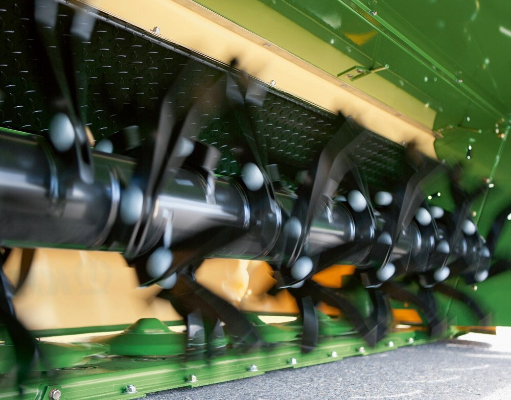 The KRONE CV rotor with V-shaped and grippy steel tines spreads the crop at the full working width. Its massive 640 mm diameter and the helical arrangement of the tines warrant a continuous crop flow, high throughputs and superior conditioning.