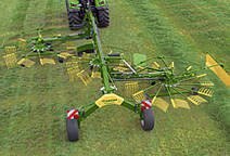 | The central suspension: The rotors suspend centrally across the direction of travel which allows them to produce consistent and high-quality windrows. The special suspension ensures they always stay level as they lift and lower on the headland. In addition, the machine’s weight is distributed uniformly on all wheels of the running gear as it travels down the field. |