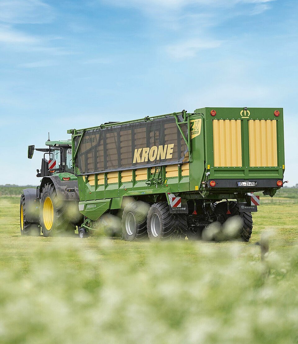 The KRONE ZX dual-purpose loading and forage transport wagon is impressive all along the line thanks to its modern design, innovative technologies and excellent forage quality. With the high-performance 'OptiGrass 28 and 37' cutting systems, it offers a clean, precise cut as well as structured and homogeneous forage conditioning across the entire width. Maximum power and efficiency round off the programme. The ZX sets new standards in the high-performance loading and forage transport wagon segment. |