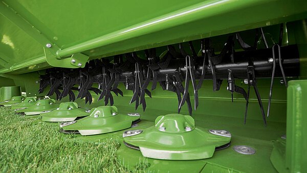 The BiG M 450 sources its super sturdy disc mowers in HeavyDuty specification from the well-proven EasyCut range. The power flow enters the mower from the rear through the gearbox and flows down a driveline of massive and quiet-running spur gears that drive the satellite gears and the discs. KRONE SmartCut implements a generous overlap of those discs that turn away from each other, which translates into a perfect cut. Meanwhile, the SafeCut system protects the blade from damage caused by hitting an object. |