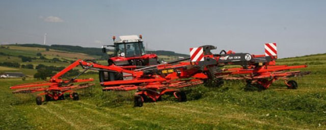 Made for high work output – High quality raking – 3D rotor suspension and wheels close to tines for optimum ground following – Rotor undercarriage with 4 pivoting wheels for good ground contouring on bends with no damage to plant cover – Adjustable working width to adapt to volume of forage – Rotor drive by MASTERDRIVE GIII gearboxes – Reinforced tine arm fastening – integrated hydraulic rotor drive – Operating sequences programmed for easy U-turns – Individual or simultaneous rotor lift for a perfect finish, even in corners – All functions controlled from the tractor cab with the built in ISOKUHN VT 50 terminal – Floatation system transfers some of the rotors’ weight to the chassis– Large diameter undercarriage wheels for good bearing capacity and hold on slopes.