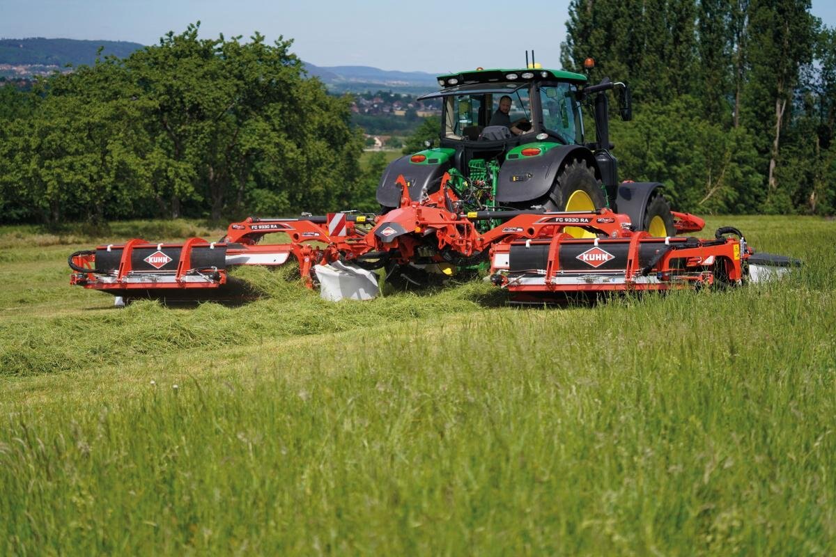The KUHN FC 9330 D RA works in combination with the FC 3125 DF or FC 3525 DF front mounted machines allowing operators to cut and condition up to 30’6” in one pass, with impressive industry-leading features. This machine incorporates the heavy-duty Optidisc® Elite cutterbar utilizing a through-bolted design and is lubed-for-life. Operators can use the 2-speed DigiDry® finger conditioner and lay the windrow out wide like a standard machine or merge the windrow to the center of the machine with the rear mounted foldable windrow merger system, allowing the operator more diversity in windrow placement. |