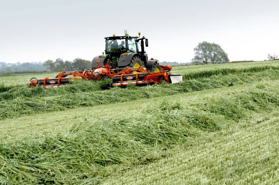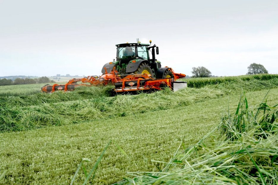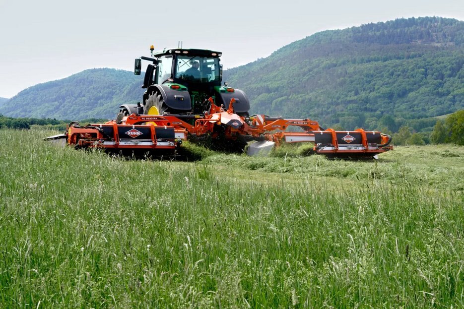 The KUHN FC 9330 D RA works in combination with the FC 3125 DF or FC 3525 DF front mounted machines allowing operators to cut and condition up to 30’6” in one pass, with impressive industry-leading features. This machine incorporates the heavy-duty Optidisc® Elite cutterbar utilizing a through-bolted design and is lubed-for-life. Operators can use the 2-speed DigiDry® finger conditioner and lay the windrow out wide like a standard machine or merge the windrow to the center of the machine with the rear mounted foldable windrow merger system, allowing the operator more diversity in windrow placement. |