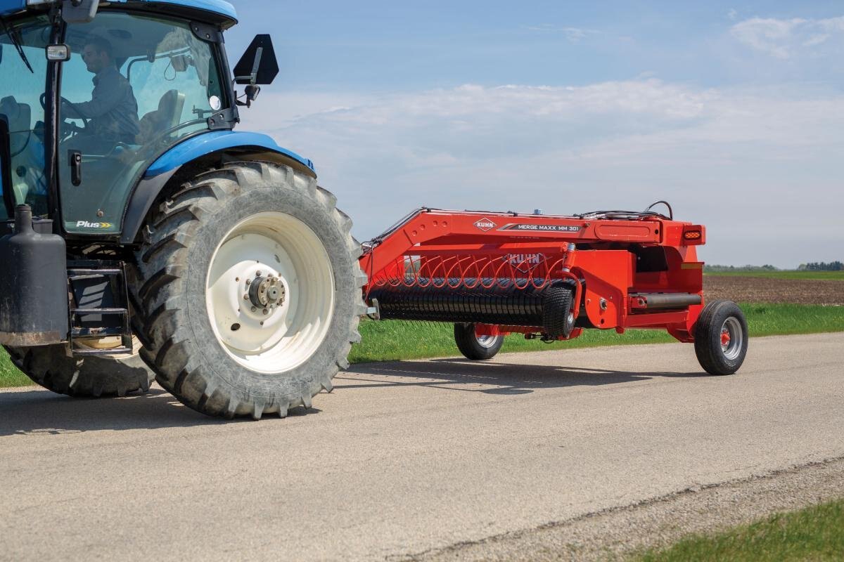 The KUHN MM 301 is a high performance, yet simple to operate merger for smaller farms focused on high quality hay and forage. Designed to work with mower conditioners from 9’ to 18’ of cutting width, this merger features a wide pickup and belt cross conveyor that can easily be shifted for ideal windrow placement. The windguard, exclusive in its class, evens out crop flow for superior windrow uniformity. Quickly merge two swaths into one in a single pass, or three windrows in two passes for improved harvester efficiency. ​