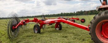Since the first introduction, the SpeedRake® name has been recognized for quality. The KUHN SR 100 GII Series SpeedRake wheel rakes have taken that reputation even further, combining the proven quality, reliability and simplicity that you expect, with next level features to excel even further beyond the competition.   Refined styling, higher strength materials and improved options deliver the most value for your equipment dollars. Exclusive in this machine class, the patented windrow adjustment feature allows independent adjustment of the windrow width and raking width to best match specific crop and pickup needs. A built-in mechanical rake arm flotation slot provides superior terrain following without the need for a tractor with hydraulic float. The simple selector valve provides fast, easy switching between transport and field positions to save time and maximize productivity.