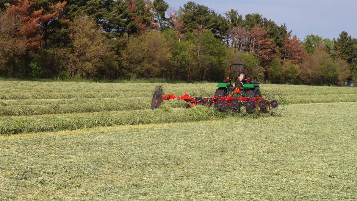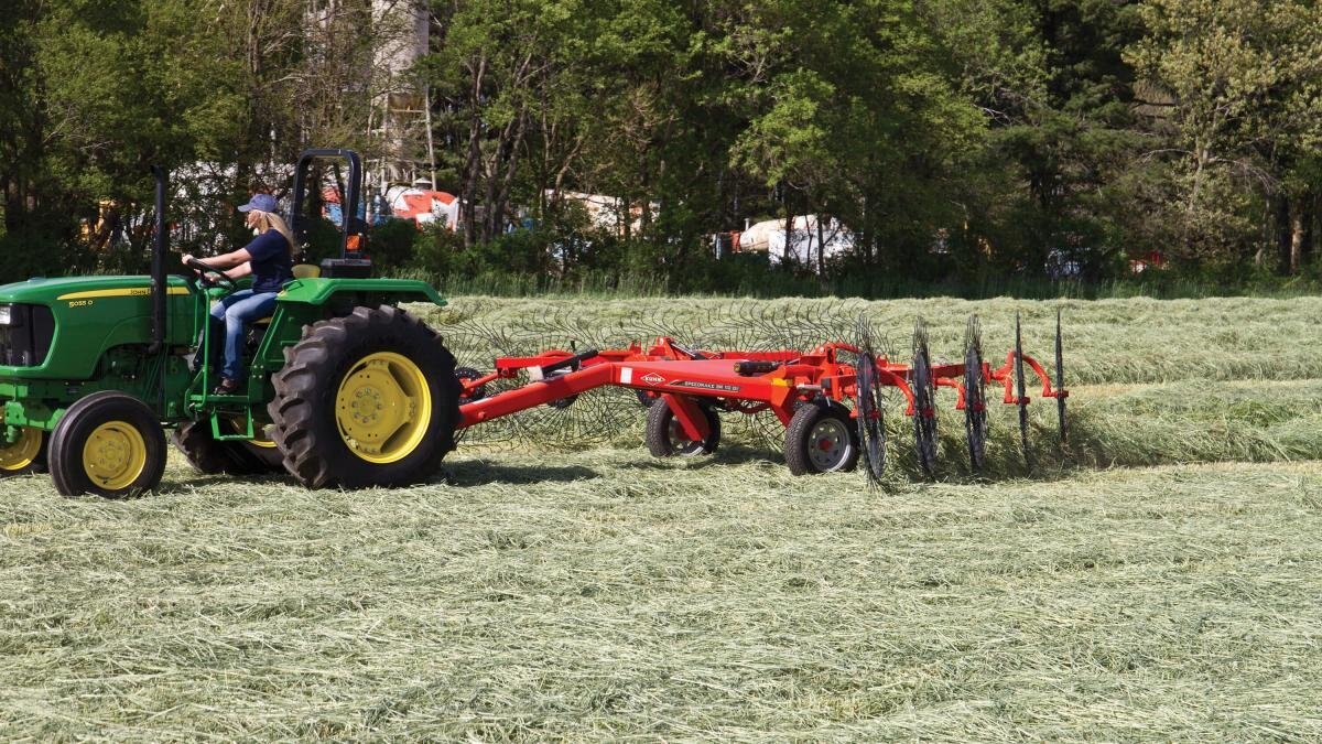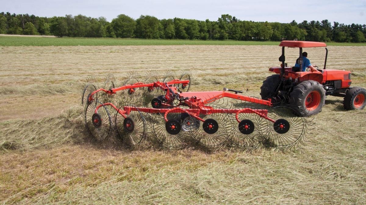 The 55” diameter rake wheels can move large volumes of crop. The right- and left-side wheels are designed to gather the crop smoothly along the wheels while forming a uniform windrow. The curved, elkhorn-style rake arms provide additional clearance for high-volume crops and reduce bunching while raking.