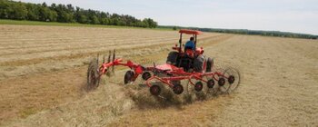 The 55” diameter rake wheels can move large volumes of crop. The right- and left-side wheels are designed to gather the crop smoothly along the wheels while forming a uniform windrow. The curved, elkhorn-style rake arms provide additional clearance for high-volume crops and reduce bunching while raking.