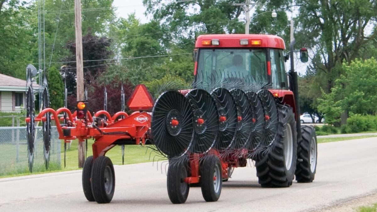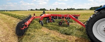 KUHN SR 300 Series SpeedRake® wheel rakes provide exceptional transportability and high-capacity raking to help you achieve optimum harvest productivity. The unique hybrid design, between a carted rake and a bi-fold rake, offers simplicity and high clearance, allowing you to tailor the machine to the needs of your operation. Individually floating, high-capacity rake wheel arms and a high-clearance frame offer clean raking and even crop flow for a fluffy, uniform windrow. The innovative hydraulic, parallel-folding design provides convenient operation from the tractor seat. Cantilever main raking beams eliminate the need for caster support wheels, which allows for raking closer to fences and other obstructions. The articulated rake beams allow for simple adjustment of windrow width while maintaining gentle crop flow to the windrow.