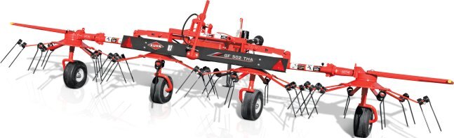 The drawbar-style hitch, of the GF 222 T and 502 THA tedders, allows for simple and easy attachment compared to mounted and semi-mounted models. When folding into the transport position, the tines on the GF 502 THA, automatically raise off of the ground for more clearance with the road. When unfolding into the working position, the tines will reset to the working height the operator had previously set. |