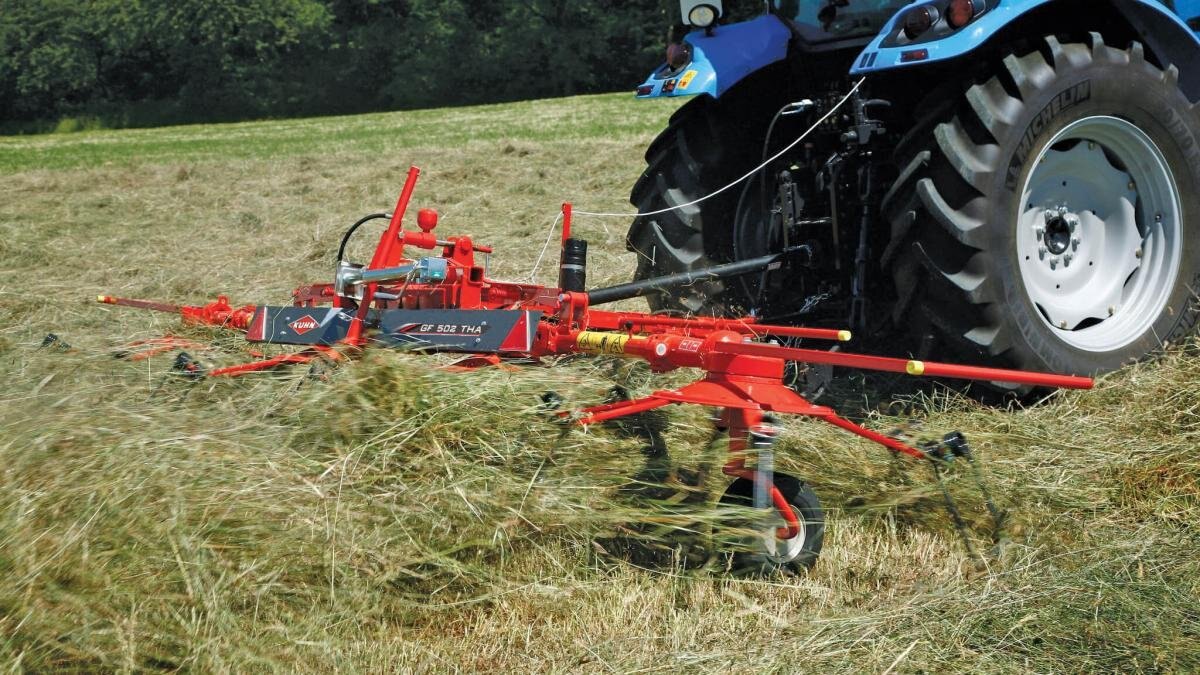 The KUHN GF 102 Series rotary tedders are designed to meet the needs of small-acreage hay producers who demand the highest quality tedding of forage to ensure even and quick drydown. These tedders have all the features required for high-quality tedding without being hard to operate. These machines feature small-diameter rotors that provide complete turnover and uniform distribution of the hay for unmatched drying speeds. The rotor height and tine angle are easily adjustable to optimize tedding in all crop conditions. Angular wheel adjustment provides oblique tedding at field edges to keep hay from being thrown out of fields or onto fences. |