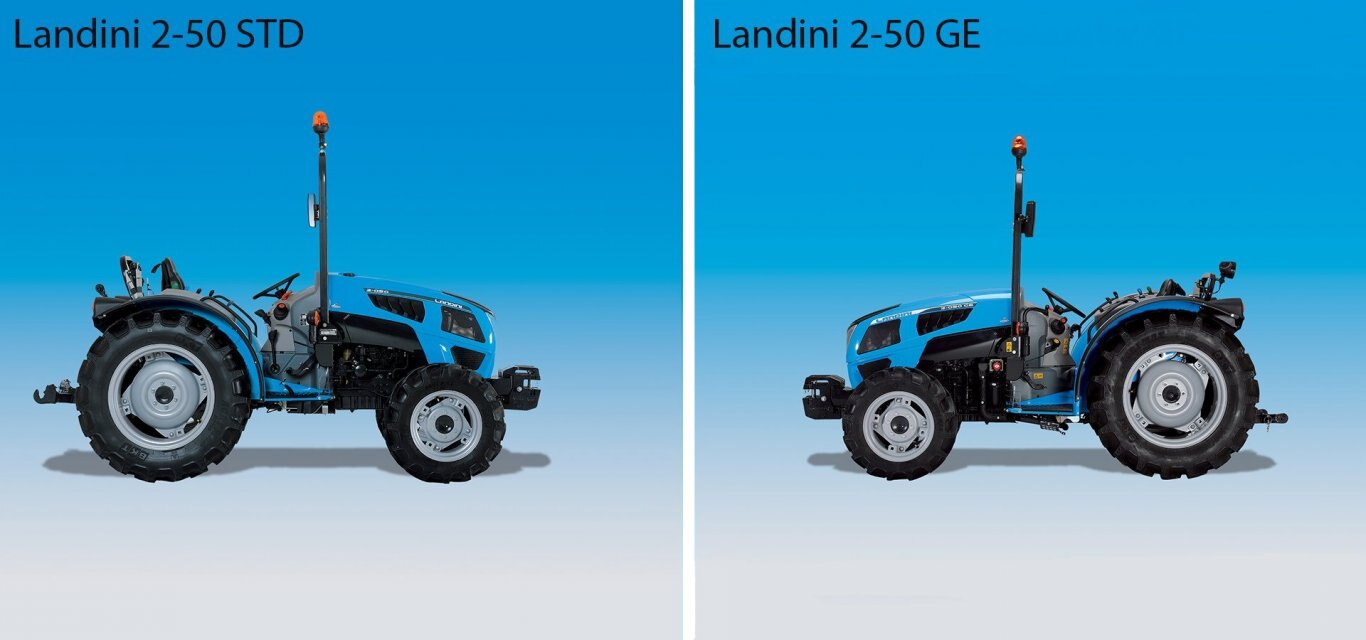 Compact nimble tractors ideal for easy manoeuvring in tight spots The 2 Series comes in two models: STD with the choice of either cab or platform, and GE only available in platform version. On the GE model, the design of the front axle and rear final drives allows the driving position to be lowered by 95 mm as compared to the STD version; this results in better performance in tight and low spaces such as overhead trellis vineyards and greenhouses |