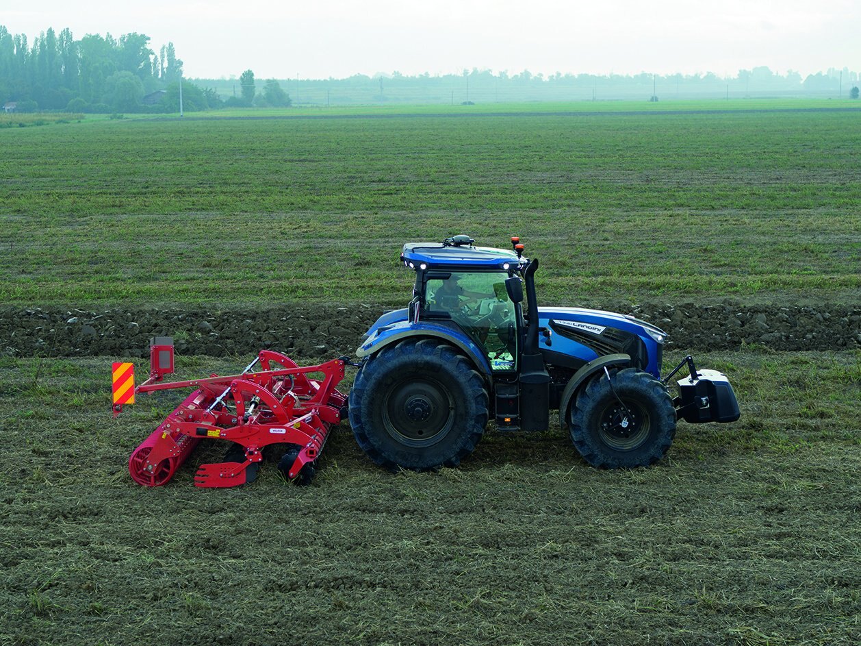 Series 7 in Stage V features some elements of continuity with Stage IV starting with the typical cast-iron chassis that houses the generous and fuel-efficient engine. The chassis increases the strength of the transmission, ensures a lower level of vibration, improves traction, increases manoeuvrability and eliminates the need for additional front equipment chassis. Thanks to a larger tank capacity, the efficiency of the machine is improved during the working day. With a wheelbase of 2,820mm, an unladen weight of 8,300kg and 13,000kg when fully loaded, it has a front balance of 46% and rear balance of 54%, as well as high towing efficiency. The change in emissions legislation has led to the introduction of new styles and designs. In the latter area, one of the most obvious product improvements is a 360-degree viewing angle, guaranteed by 20 LED headlights, 12 of which are on the roof, also featuring a new design and canopy in perfect Landini style. |