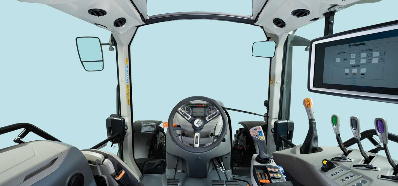 A distinctive feature of the new “Landini High Vision” cab is the FOPS-homologated panoramic roof and the hatch for natural ventilation which enhance the tractor’s performance when using the L40 front loader for bales handling. Also worth mentioning are the LED headlights. Up to 14 headlights are available, 8 of which are incorporated in the roof to provide excellent night vision. The cab sports a mechanical suspension that, combined with the suspended front axle with independent arms further improves driving comfort. The cab is designed with high quality automotive-derived materials. The same attention to design and functionality is found in the control instrumentation with its fully ergonomic design, a 12-inch touch screen monitor and all-in-one multifunction joystick. |