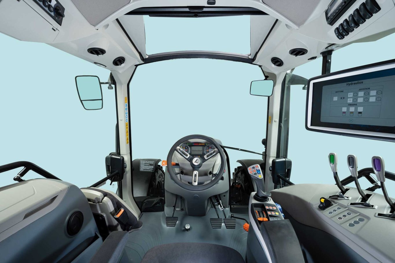 The closed-centre hydraulic system features a 114 l/min pump capable of handling up to 7 spool valves (electronic and mid-mounted ones) and an electronically controlled rear hitch with a maximum capacity of 7,200 kg. The front hitch lifts up to 2,500 kg. |