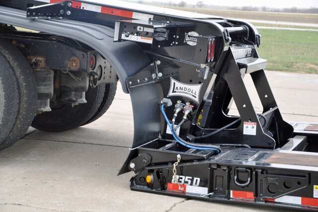 versatility plus many standard featuresThe Landoll 800 Construction Series’ versatility originates in its primary standard features. The new innovative 4-beam frame features a flat deck with a loaded height of 18". The 835C is a 2-axle, 70,000 lb. capacity with a 12’ concentrated deck rating. The 835 two axle frame is third flip axle ready. |