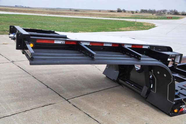 Patented gooseneck design - flexibilityThe gooseneck is a Landoll patent that gives the operator the control at his fingertips. Swing clearance is 84", with a pin setting of 15". The 7-position ride height on the 11'9" gooseneck gives needed ground clearance and lowers the deck height to carry extremely high loads. No other gooseneck offers such flexibility as the Landoll 800C Series. |