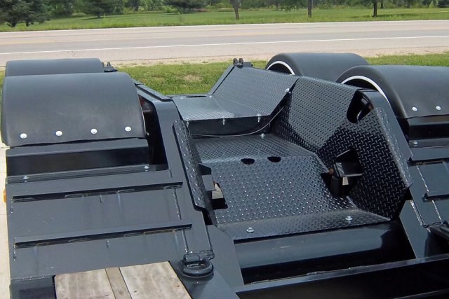 complete packageThe 800 Construction Series is the complete package. Maximum lower deck length allows you to position your loads and scale legally. For heavy loads, the base trailer comes standard with flip axle brackets and air/electrical couplers. To move a permit load with ease, an optional flip axle can be added. The 800C Series is work ready with a flattened front approach, apitong wood in track area, a recessed storage compartment and swing-out overwidth extensions. The front, double outrigger is for added strength at the break over. There are traction bars on the approach and on the front half bolster for added traction. |