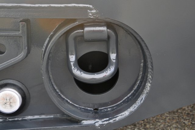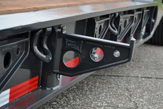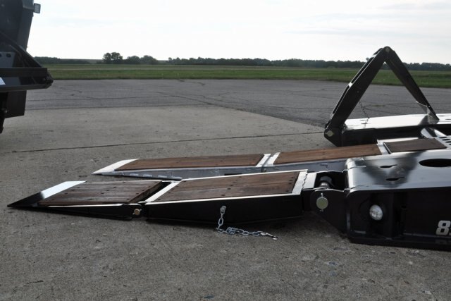 Patented gooseneck design - flexibilityThe gooseneck is a Landoll patent that gives the operator the control at his fingertips. Dual swing clearance is 108" and 90", with dual pin settings of 15" and 33". The 7-position ride height on the 12'5" gooseneck (10'9" gooseneck standard on 48') gives needed ground clearance and lowers the deck height to carry extremely high loads. No other gooseneck offers such flexibility as the Landoll 855-PS Paver Special. |