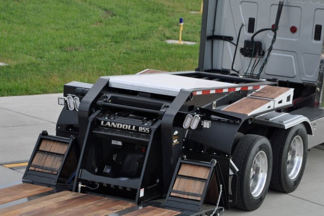versatility plus many standard featuresThe Landoll 800 Paver Series’ versatility originates in its primary standard features. The new innovative 4-beam frame features a flat deck with a loaded height of 19-1/2". The 855-PS is a triple axle, 110,000 lb. capacity with a 12’ concentrated deck rating. The 855 three axle frame is fourth axle ready. |