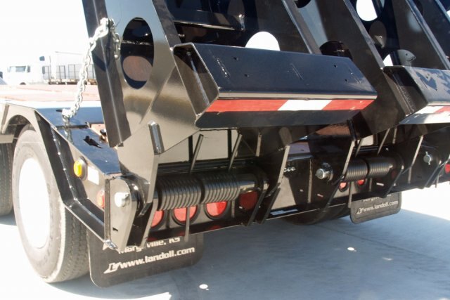 The Model 150 fixed gooseneck beavertail trailer with triple axle and 50 ton capacity was designed to haul light and heavy construction equipment without hydraulics. The Landoll 150 features a rugged four-beam frame design with a longer beavertail that reduces the loading angle. The beavertail is equipped with self-cleaning adjustable spring assisted flip over ramps.