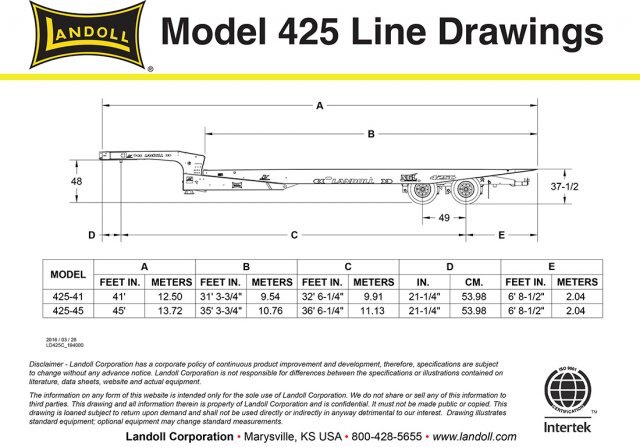 The Model 425 is a medium-duty, tandem axle, 25 ton capacity trailer available in lengths of 41' and 45'. The 425 is ideal for narrow, tight, winding road and inner-city applications with a lighter hauling capacity. The 425 may be a medium-duty trailer however, it still boasts all the features of the 400 series.